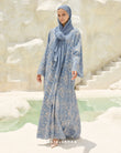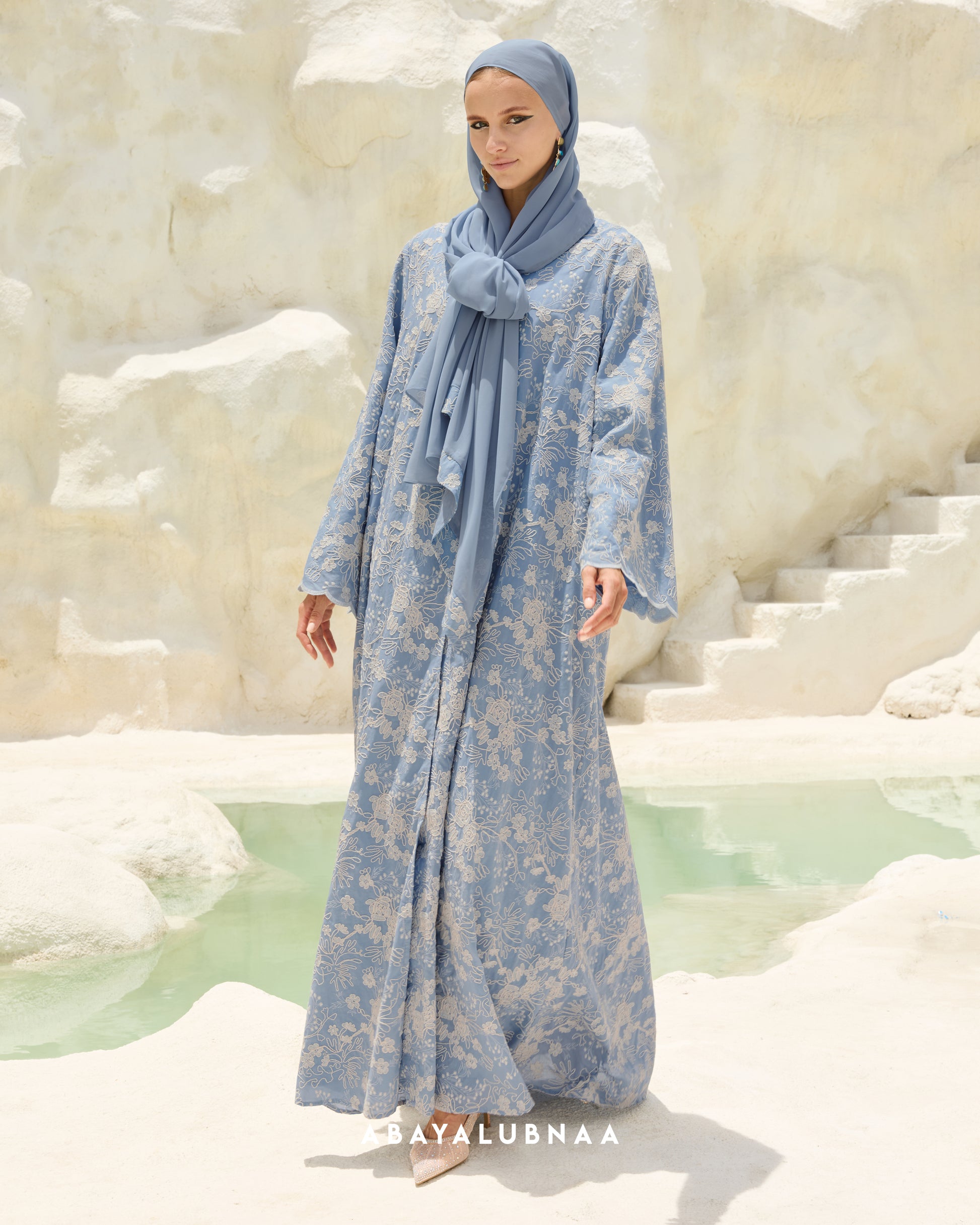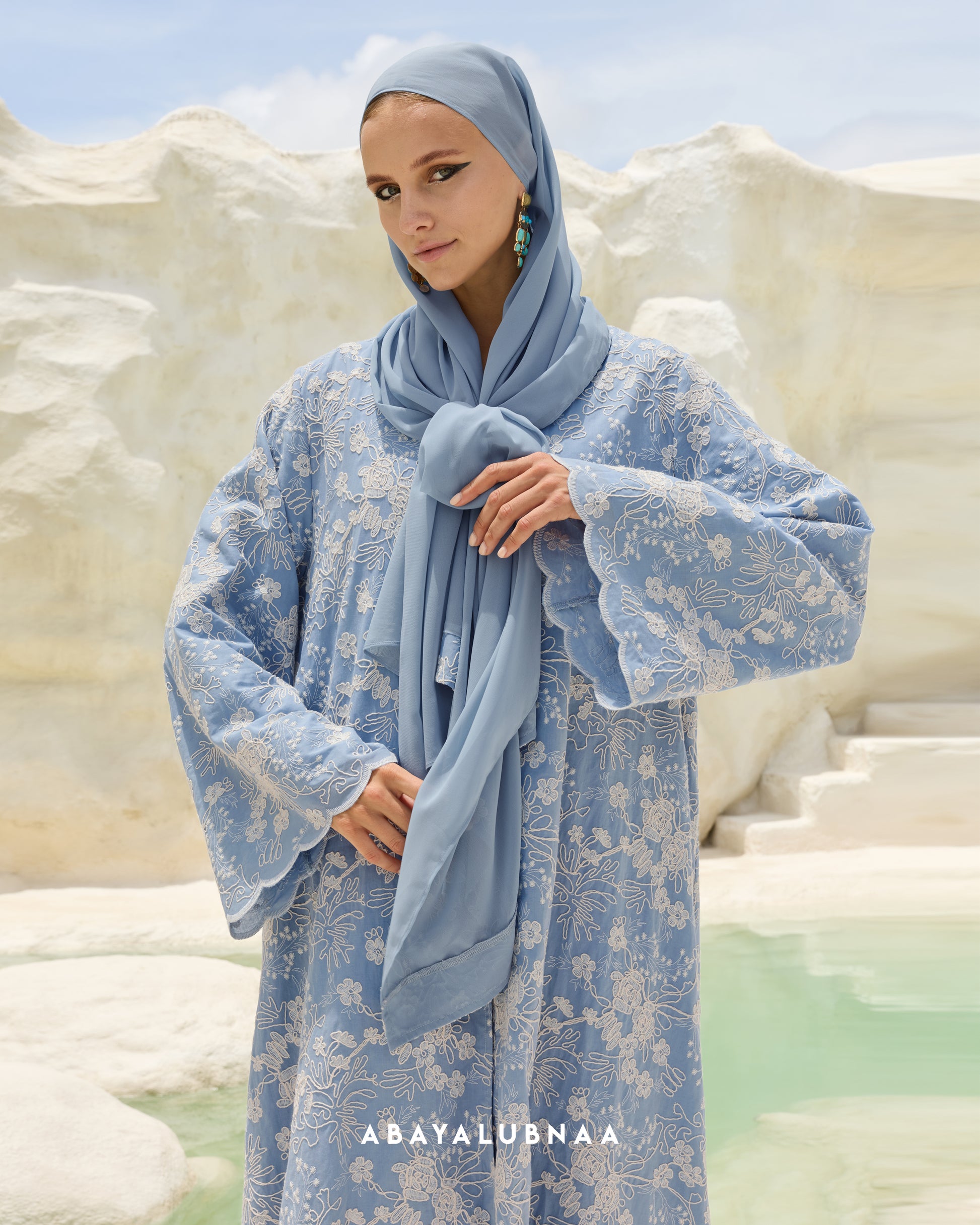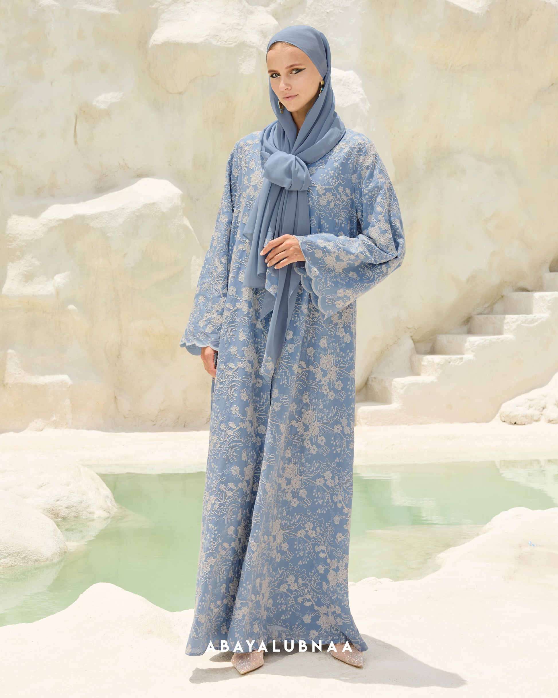 Fatma has a sweet and delicate tone, showcasing flowers in a fully lined abaya with scalloped cuffs and a relaxed silhouette. Fatma is decorated with textured flowers in a contrasting colour, creating a bold look without being too loud.