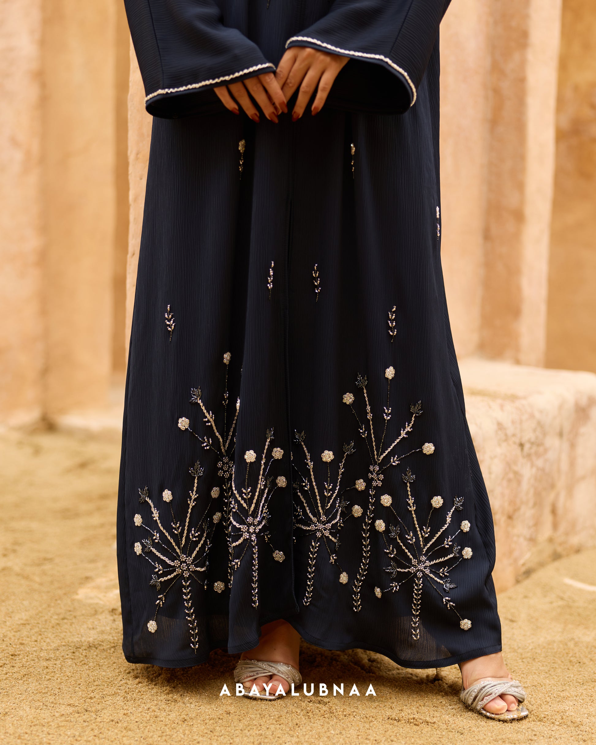 A gorgeous design offering comfort and sophistication, Hanan doesn’t shy away from glitter. A scatter of floral beading adorn the abaya with luminous pearls and sparkling lunettes forming lavish bouquets on the hem.