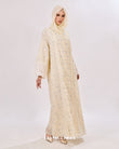 Highlights of Isma include a pastel flower print and contrasting panels that frame the cuffs. Thick lace borders and eyelets anchor the abaya, adding different textures for more depth and dimension.