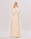 Highlights of Isma include a pastel flower print and contrasting panels that frame the cuffs. Thick lace borders and eyelets anchor the abaya, adding different textures for more depth and dimension.