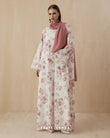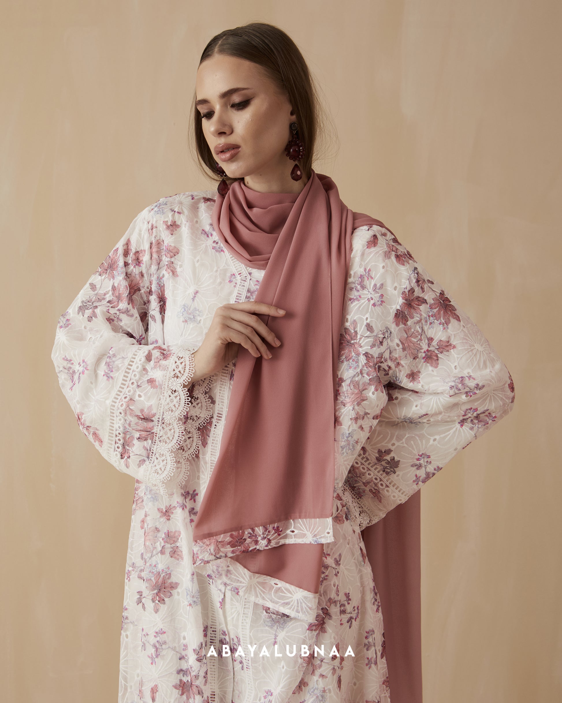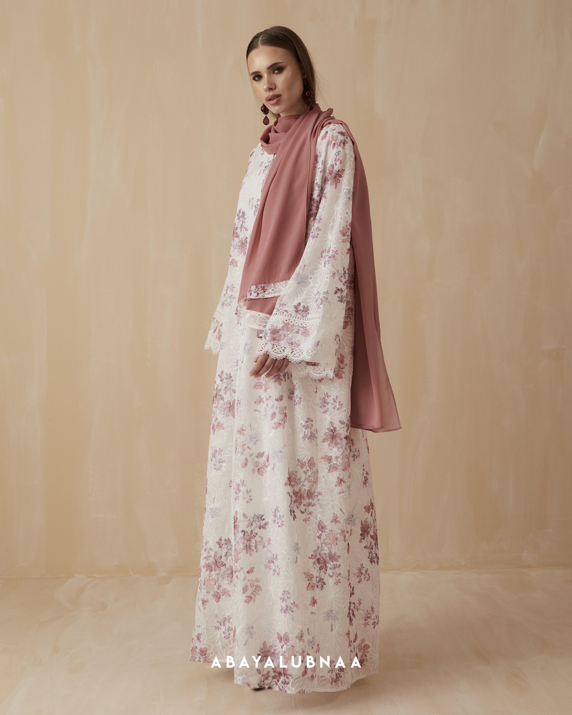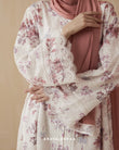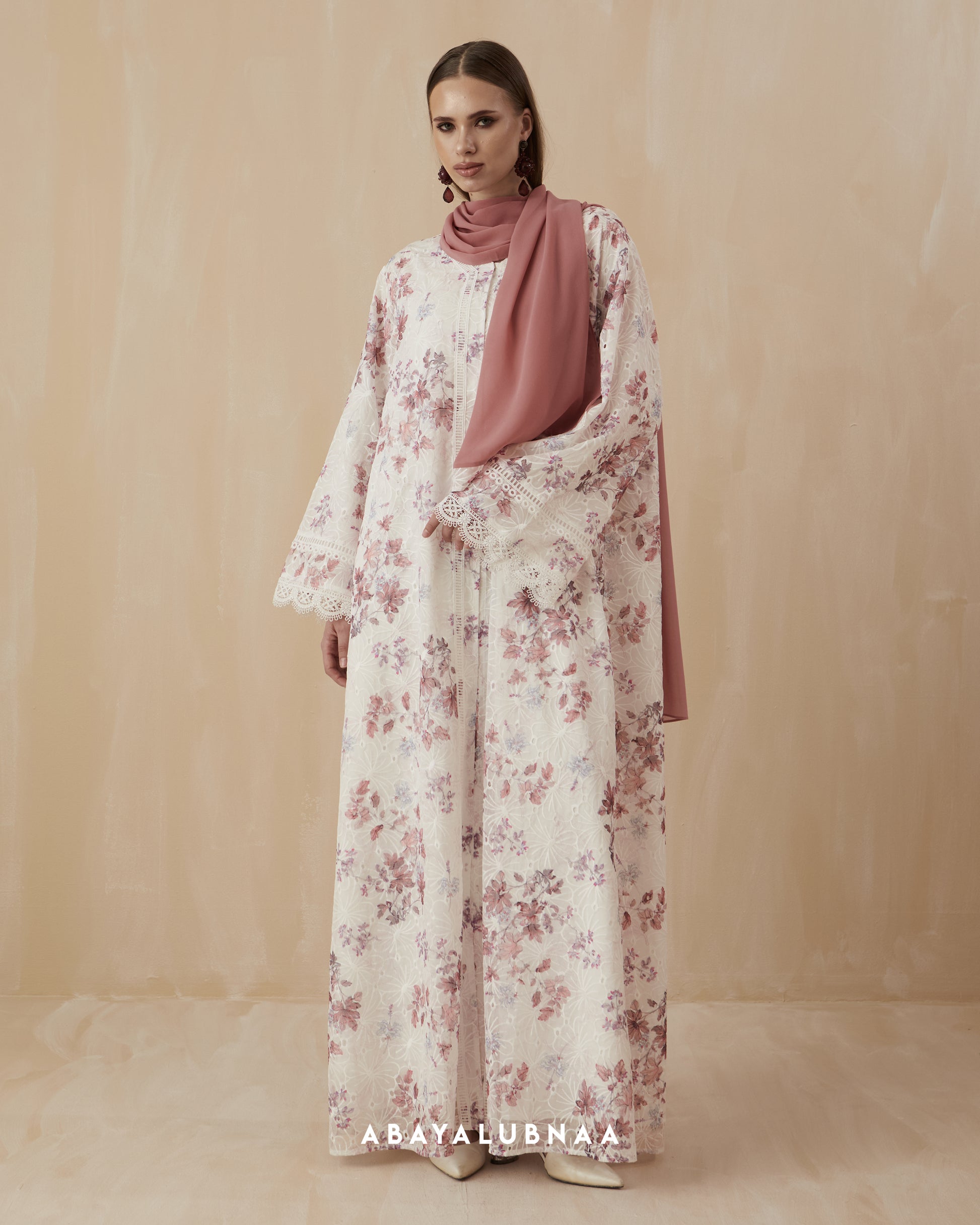 Embroidered florals over a nature inspired print gives Izara tons of character so it will look great even with minimal styling. Trimmed with eyelet lace, scalloped edges frame the cuffs, while a more geometric pattern line up the panels on the front of the abaya.
