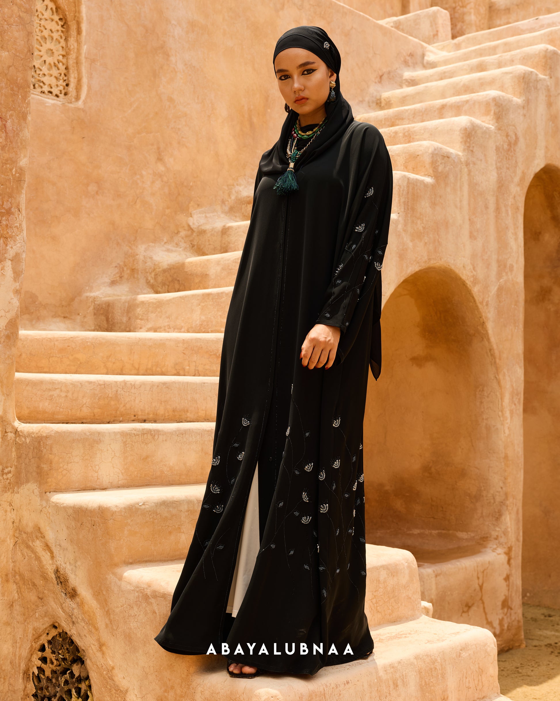 Transform every festive moment into a statement in the entrancing Layla. This embellished abaya pays homage to the glitz and glam of Moroccan fashion, showcasing contemporary sparkle in an intricate pattern of rhinestones, crystals and beads.