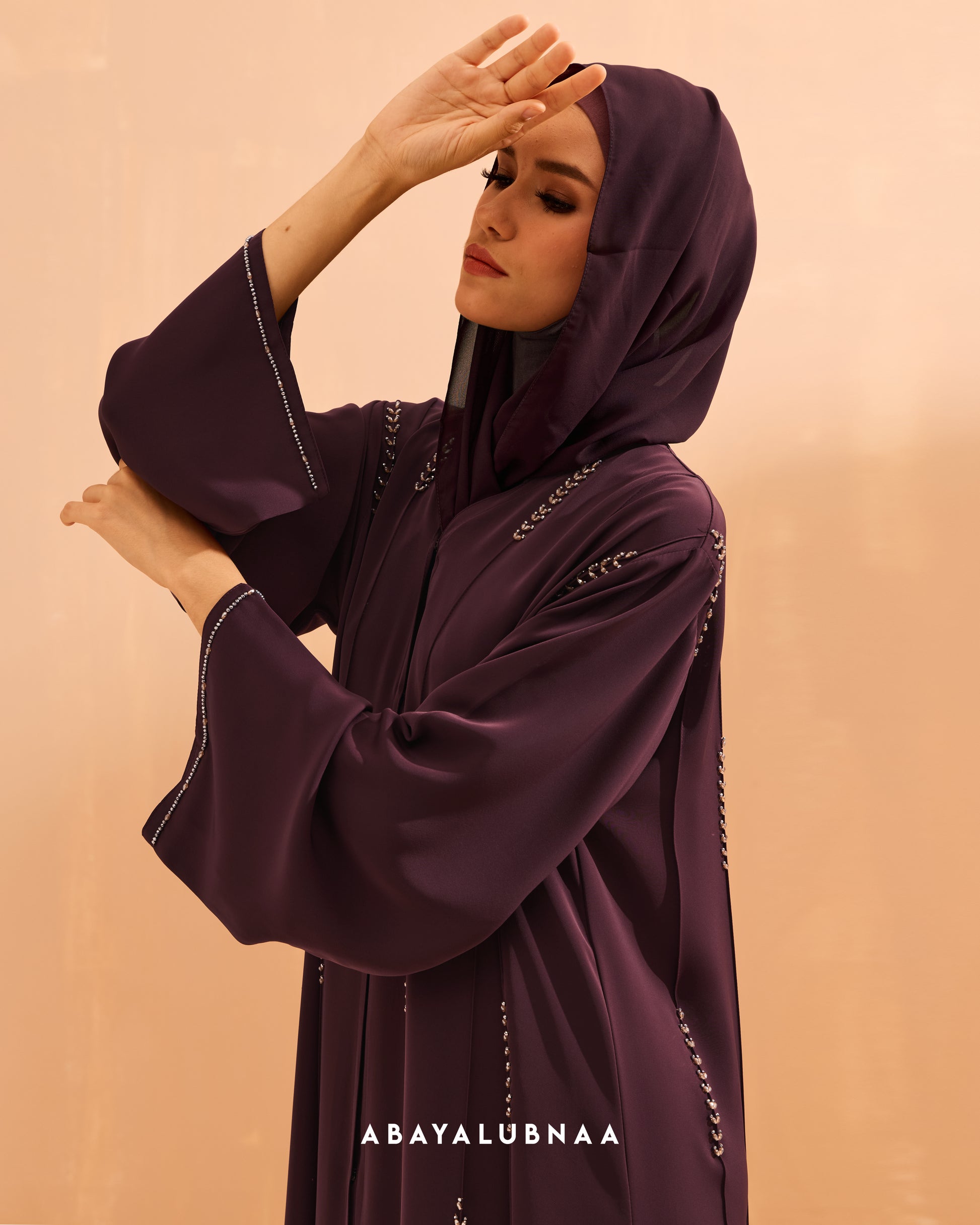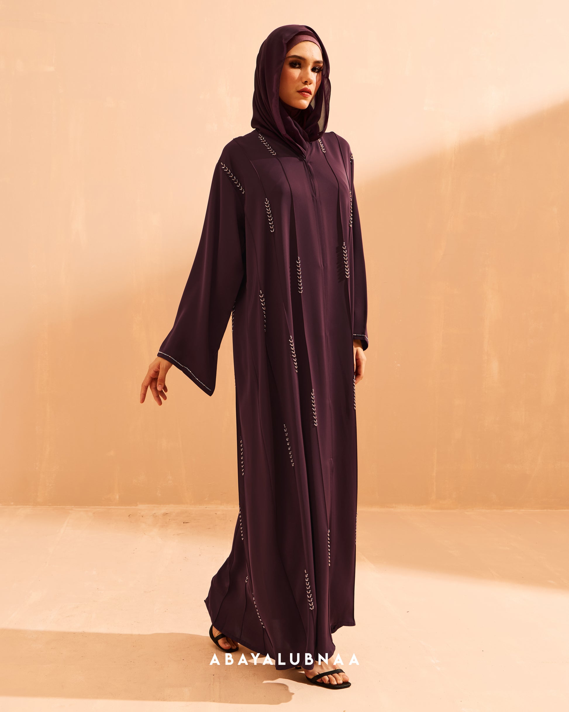 A structured open-type abaya with clean lines of sparkly beads formed in leafy motif Lumina personifies quiet luxury, making its mark through impeccable craftsmanship paired with soft premium fabric.