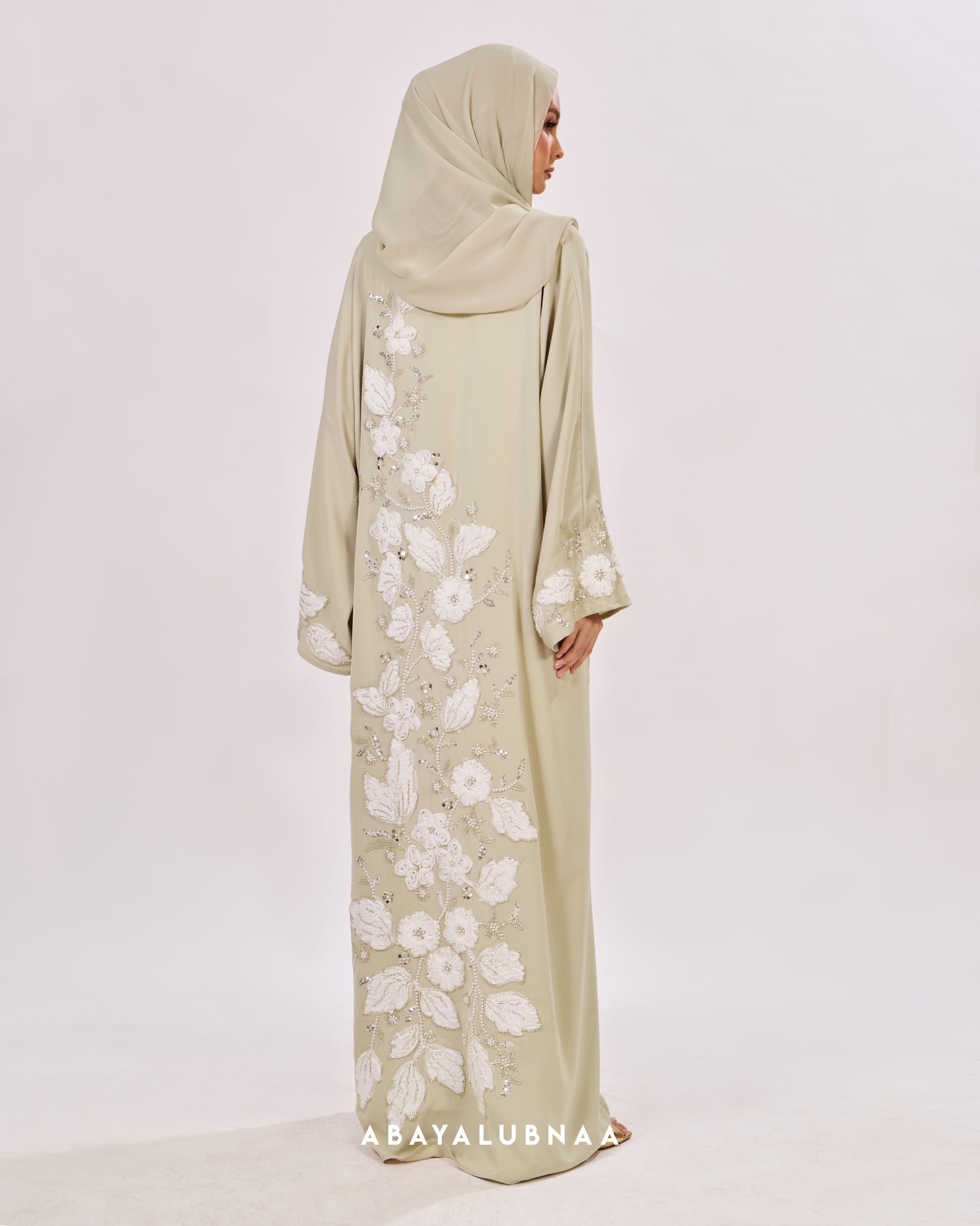 Channeling romance with a nod to vintage aesthetics, Maleeha is an elaborate abaya traced with floral lace on the cuffs and appliqued with bountiful blossoms on the sides and back.