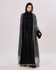 Solid tone front panels and cuffs add balance and structure, framing the abaya design beautifully. An elaborate circular design decorate the hemline, giving it an abstract and modern accent.