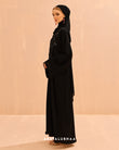 The delicate design on the bodice and sleeves resemble fine vines which mimics Morocco's botanical structures, creating a glamorous and textured look suitable for a celebratory abaya.