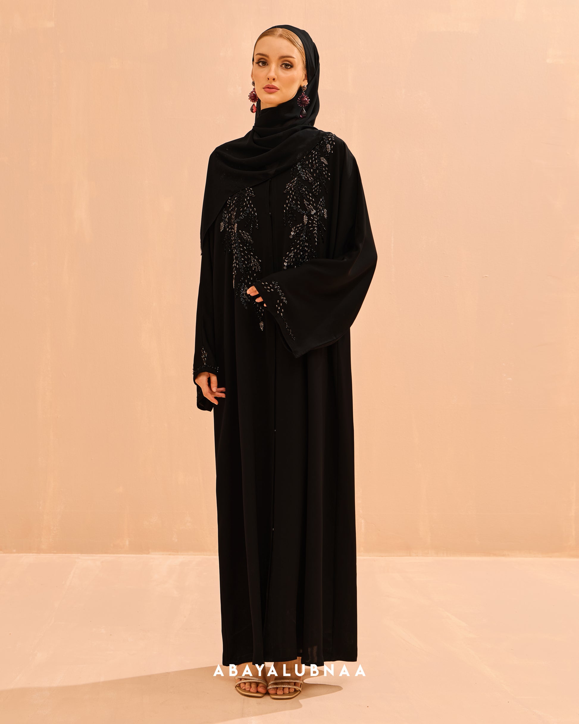 - Elegant hand-embellished abaya featuring delicate bead and sequin work in cascading floral vine patterns on the bodice and sleeves-